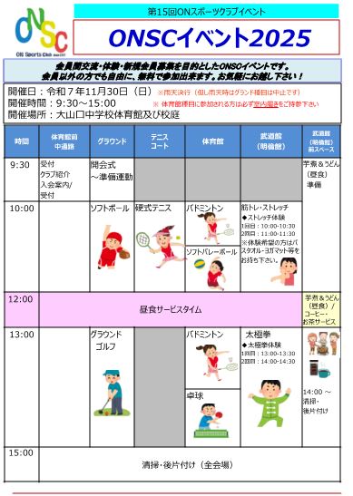 毎年恒例のONSCイベントを11月30日(日)大山口中学校(9:30〜15:00)で行います。会員、非会員の方も無料で参加できますので、「最近運動していないので身体を動かしたい」「昔、やっていたので又やって見たい」等、興味のある方は、体験して自分にあった教室を見つけてみませんか。