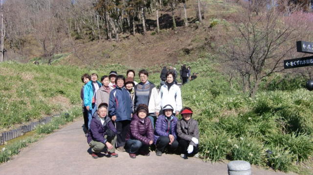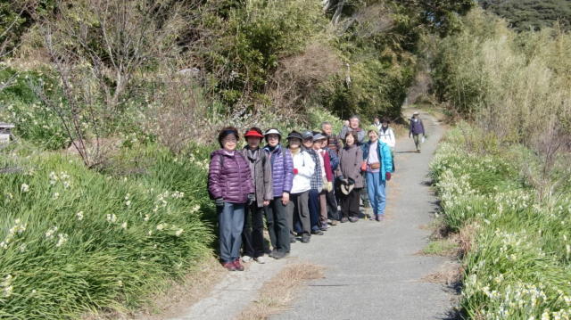ウォーキング教室では2月10日(日)、17名が参加し、鋸南町の水仙ロード・ウォークを実施いたしました。西白井駅前をマイクロバスで8時過ぎに出発、一路保田へ。保田神社前で下車、いよいよウォーキング開始。事前調査では水仙の開花状況が心配でしたが、絶好のウォーク日和で皆さん心軽くスタート。コースは水仙ロード入口より江月集落へ、道路脇や山あいの斜面には水仙が植えられ、見事に咲き誇っていました。途中水仙ひろばで早めの昼食を取り、江月山頂目指し緩やかな坂を登り、地蔵堂・いぼ神様・見返り峠を越え赤伏地区へ、ここからバスに乗り佐久間ダムへ、斜面を利用した水仙公園では水仙はもちろん、桜の花が一輪二輪と咲き始めておりました。最後は恒例の日帰り温泉で汗を流し一路白井へ、午後7時に到着し無事解散。