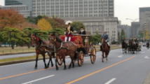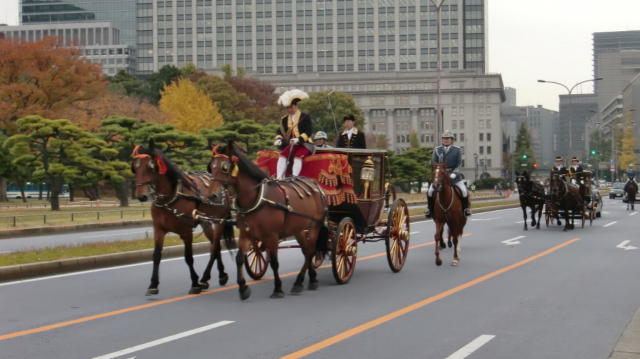 ゆっくりと紅葉を楽しみながら、江戸城の天守台・本丸・松の廊下・富士見櫓等々の跡を見学、行幸通りでは外国大使の皇居参内馬車列に遭遇、大変なサプライズでした。