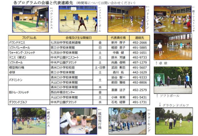 健康のために運動してみたい方、最近運動不足で身体を動かしたいけど・・・と思っている方、一度体験してみませんか? 体験・入会希望の方は各プログラム会場で直接受け付けていますので、お気軽にお越しください。また、インターネットによる問い合わせも可能ですのでコチラを活用ください。
